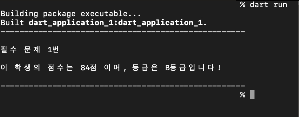 print("이 학생의 점수는 $score 이며, 등급은 $grade입니다!");